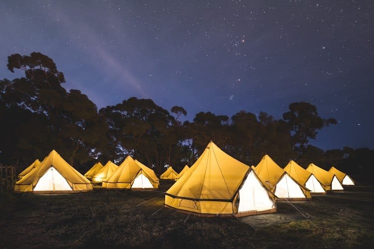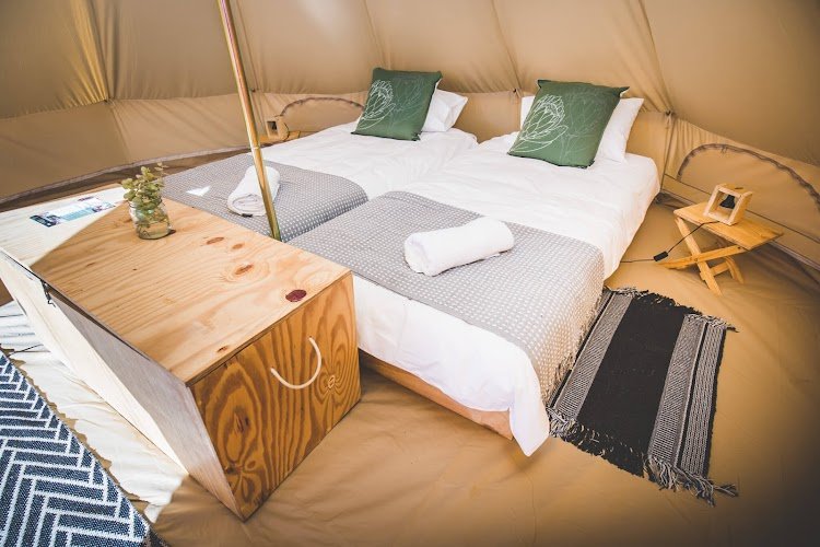 Our luxurious mobile glamping tents contains two super comfy full size single beds, quality hotel linen, floor rugs, storage chest, bedsides tables, interior lighting and director chairs.